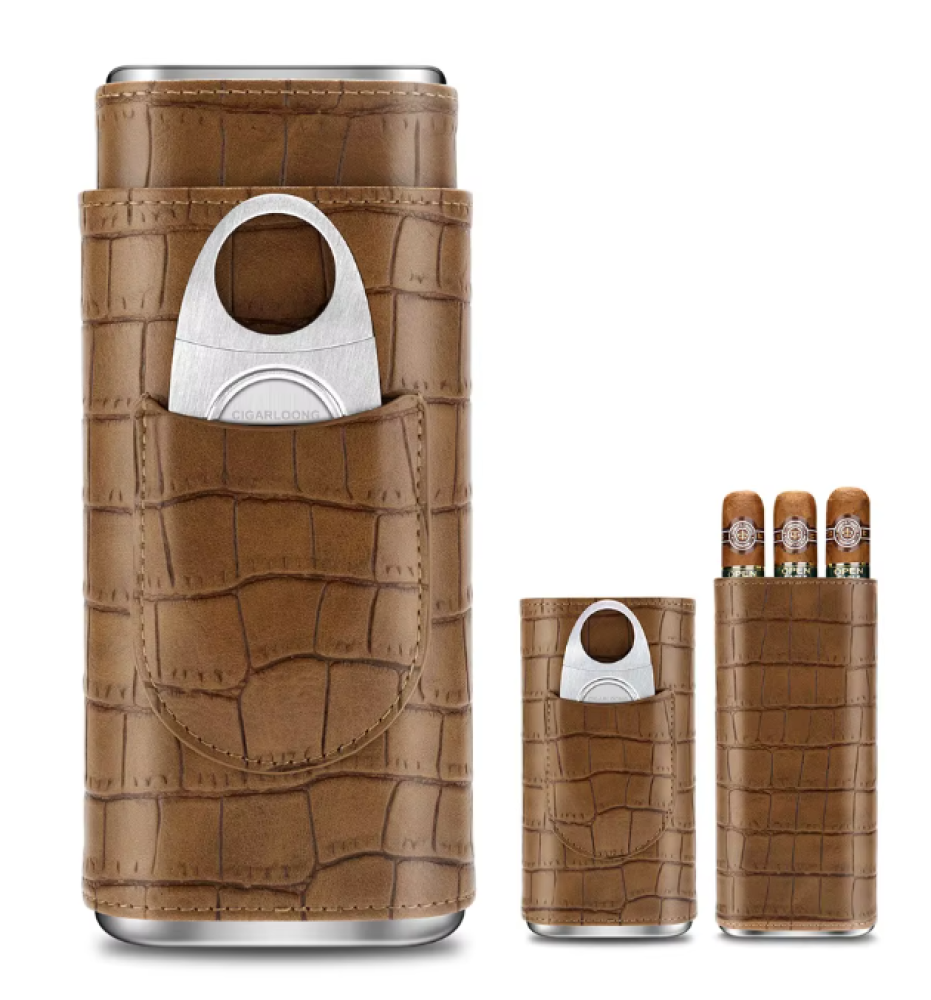 محفظة سيجار جلدية مخصصة لحمل 3 سيجار، مصممة لتوفير حماية عملية أثناء الحمل والتنقل مع لمسة فاخرة في التصميم. تأتي مع قاطع سيجار من الستانلس ستيل مدمج داخل العلبة، لتكون قطعة متكاملة للاستخدام اليومي أو السفر 🚬