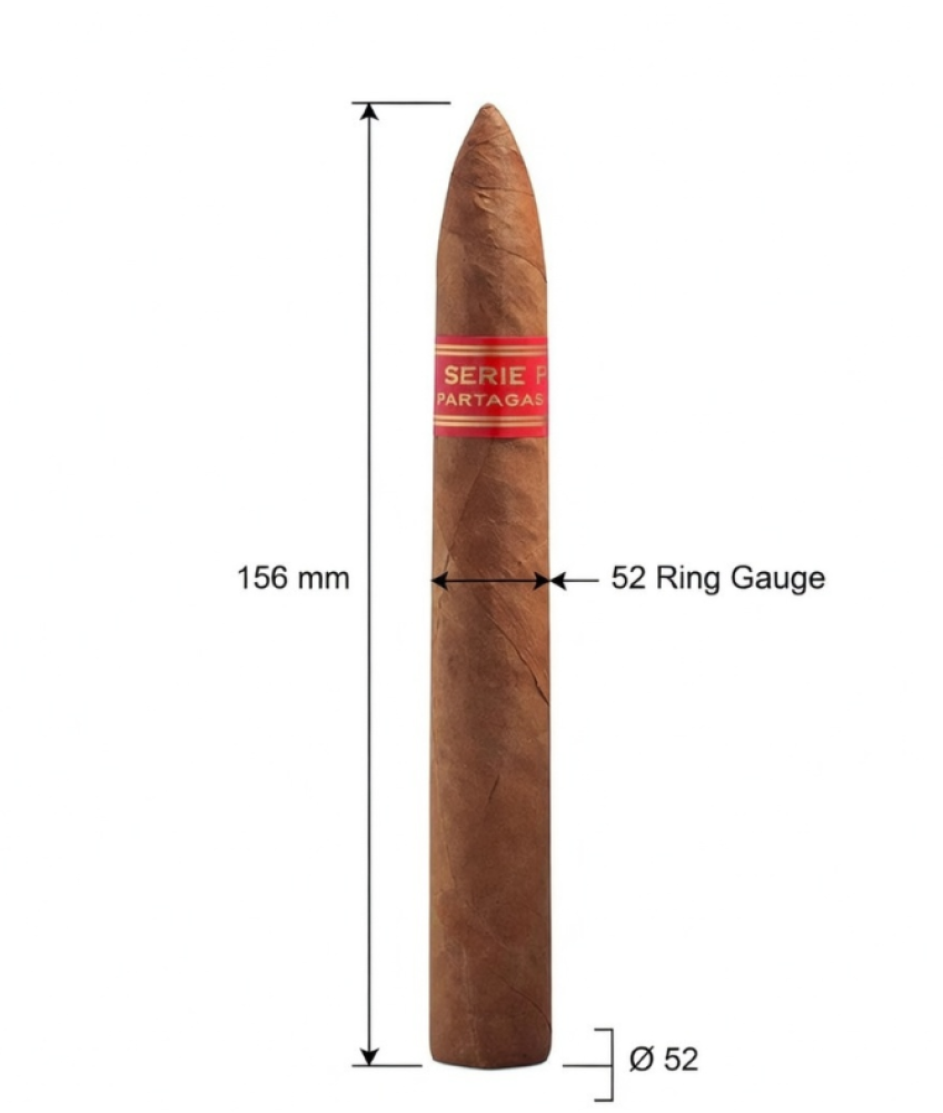 يأتي السيجار بطول 156 مم مع Ring Gauge 52، وهو مقاس يمنح دخانًا كثيفًا ونكهة مركزة مع تجربة تدخين تدوم عادة بين 60 إلى 75 دقيقة تقريبًا.